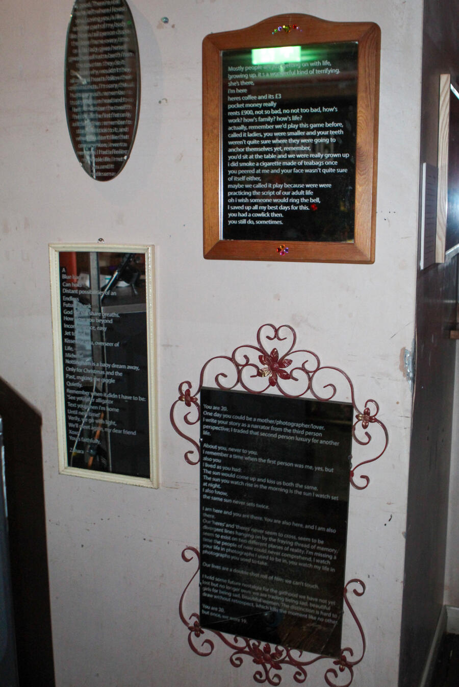 'Mirrors of me' is a 4-part installation comprised of poetry, inscribed onto mirrors, about people in my life, that shaped my life.When I talk about them, I talk about me. Actually, everything I talk about is about me: being as there is, there is no way to divide the body from its experience.The only life I know is the one I have.‘Mirrors of me’ says: here’s how I see you, through myself. Of course, when an individual looks into the mirror, they see my words but their own reflection. Which, again, is how we move through life, in our own island universes.You’re reading a book and understanding nothing of what the author meant, except for how it may pertain to your own experience. You can’t even try. All you are is you.